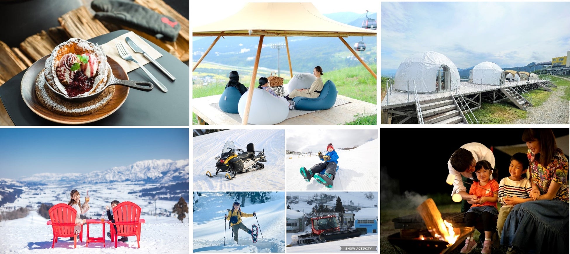 ザ・ヴェランダ石打丸山 (石打丸山スキー場)では、魚沼盆地と越後三山の山並みが広がる絶景を昼だけではなく夜景でも体験できる「ナイトテラス」と打上花火、湯沢高原パノラマパークでは眼前に連なる2,000m級の山々の大パノラマの中、地元グルメとアウトドア体験の「春の雪フェス」がお楽しみいただけます。また、両施設とも、今年の大量積雪によるスキー場の残雪を生かし、大人も子供も「ゆきあそび体験」がお楽しみいただけます。