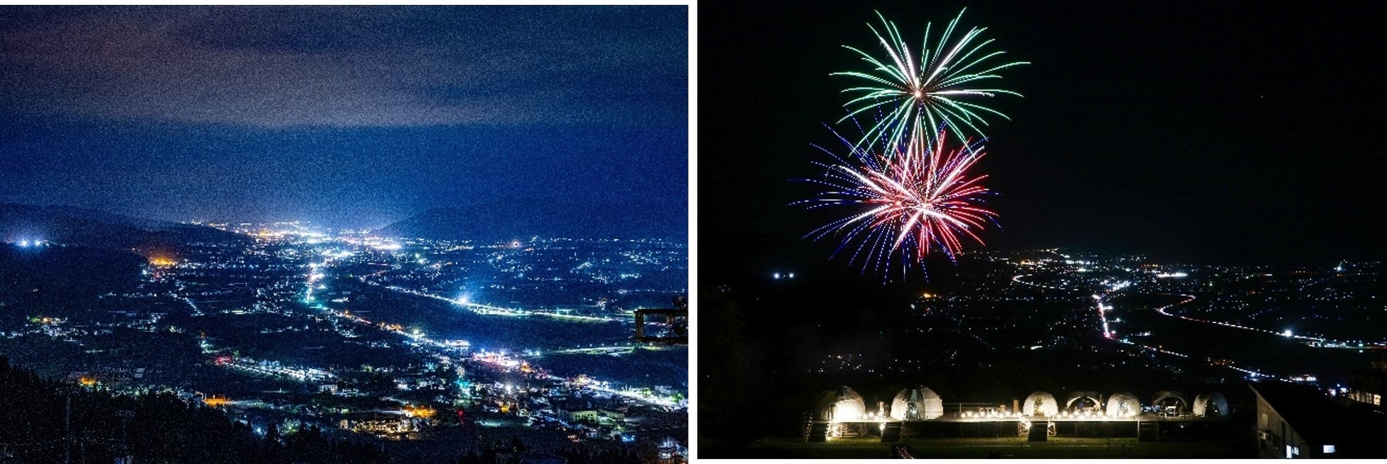 昼はコシヒカリの田植え前の田園風景、新緑と残雪の越後三山のパノラマ、期間限定、夜はナイトテラスから見える魚沼盆地にきらめく夜景との打上花火