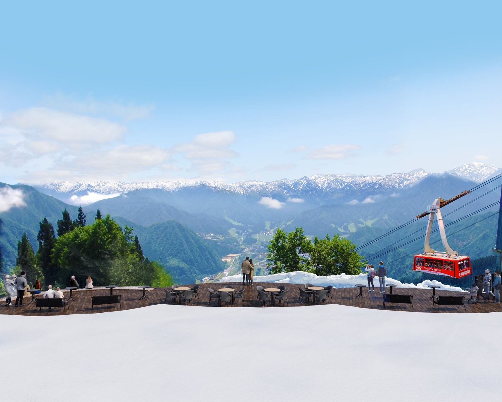 湯沢高原パノラマパーク(湯沢高原スキー場)のゴールデンウィーク営業は、4/26(土)~5/6(火・祝)の11日間の営業。標高約1,000mのkumo cafeオープンデッキエリアからは眼前には谷川連峰から越後三山までの2,000m級の残雪の山々、足元には湯沢町の新緑の大パノラマが体験でき、足湯も登場。ひんやりとした空気とぽかぽかとした足湯で心地よく癒される時間をとなります。