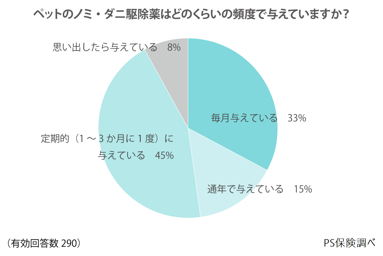 ペットのノミ・ダニ対策として「駆除薬を与えている」と答えた人に対して、駆除薬を与える頻度を尋ねたところ、「定期的(1~3か月に1度)に与えている」という回答が最多の45%となりました。