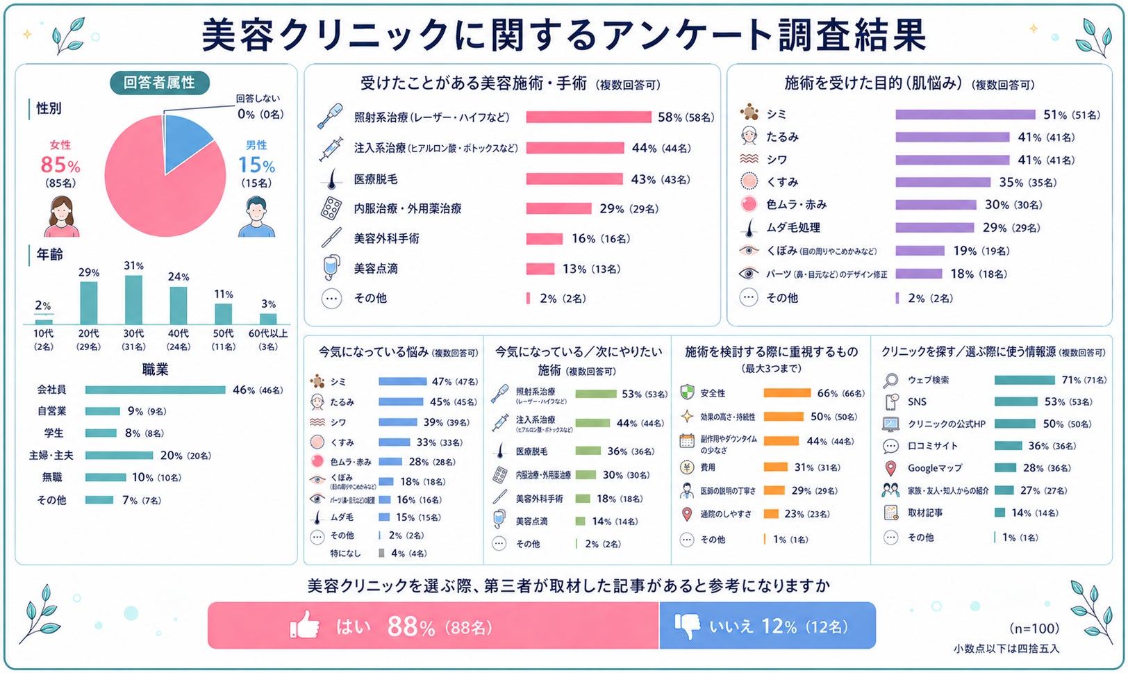 近年、美容医療が身近になりつつある分、施術の種類やクリニックを選ぶことの難しさを感じているユーザーも少なくありません。そこで本調査では、医師取材記事の分析に加え、実際に美容医療の施術・手術を受けたことがある生活者100名を対象にアンケートを実施。美容医療に対する意識を、調査データと取材記事から多角的に分析しました。