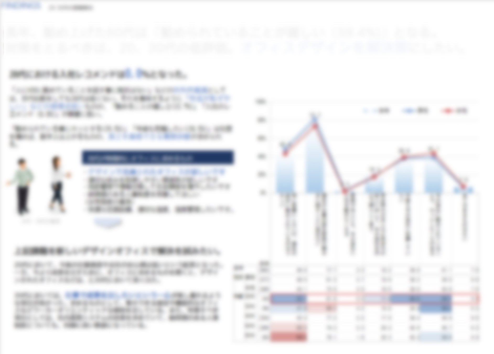 新しいオフィスのデザインや方向性を明らかにするべく、従業員の思考性を数値化し、これらのリサーチを経て、「世代差による価値観の違い」や「従業員から噴出する疑義」などの課題を導き出しました。