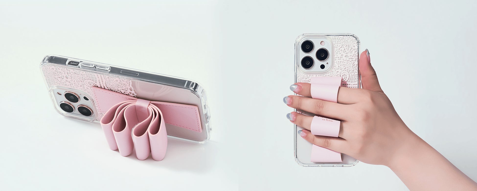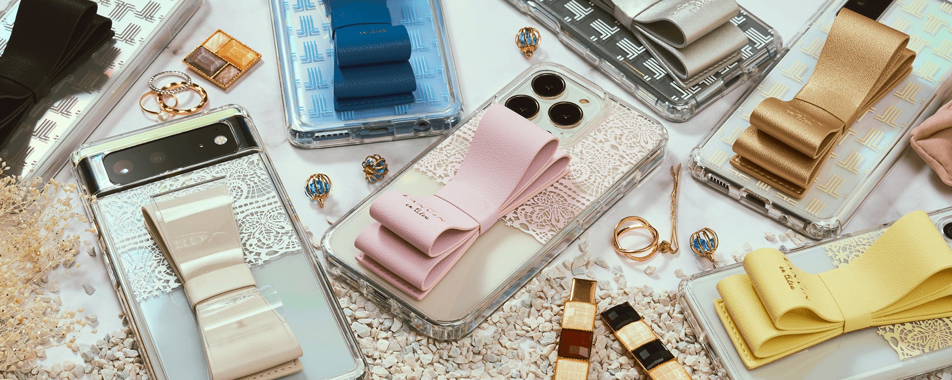 スリムプロテクションケース STAND & RING RIBBON は、背面のリボンを畳むとスタンドとして縦にも横にも使用することができ、リボンに指を通すとスマホリングのようにも利用できる優れものです。クリアベースの2種のデザインと7カラー(Black、Sakura Pink、Navy、Clear、Lemon Yellow、Gold、Silver)のリボンの組み合わせで全14デザイン、iPhone/Androidを含めた機種対応で展開します。