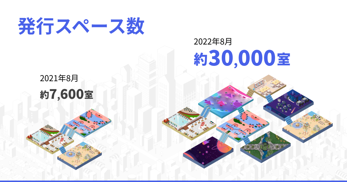 発行したスペース数は累計3万室。建設されたバーチャルビルの数も1000棟以上となっており、バーチャル空間のご利用が広がっています。なかには100フロア以上を利用し、従業員の方々が日々勤務している企業もあります。
