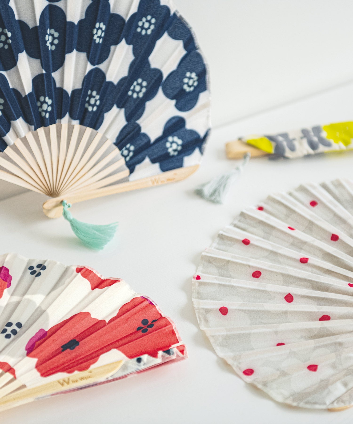 2023年春夏の新作は「レジャーシート」「ギフトボックス入り扇子」「手ぬぐい」「グラス」「大判ハンカチ」「クッションカバー」の6種類。どれもレイングッズブランド「Wpc.」の傘で人気のテキスタイルデザインを使ったライフスタイルグッズで、毎日の生活が明るくなるような華やかなデザインばかり。これまでの既存の商品も新しいデザインを追加しながら展開していきます。