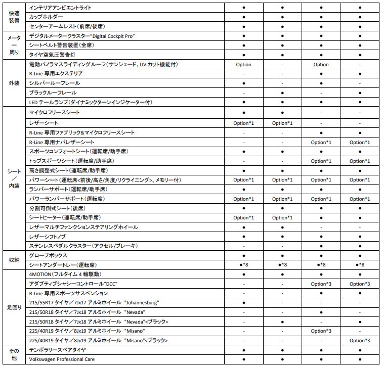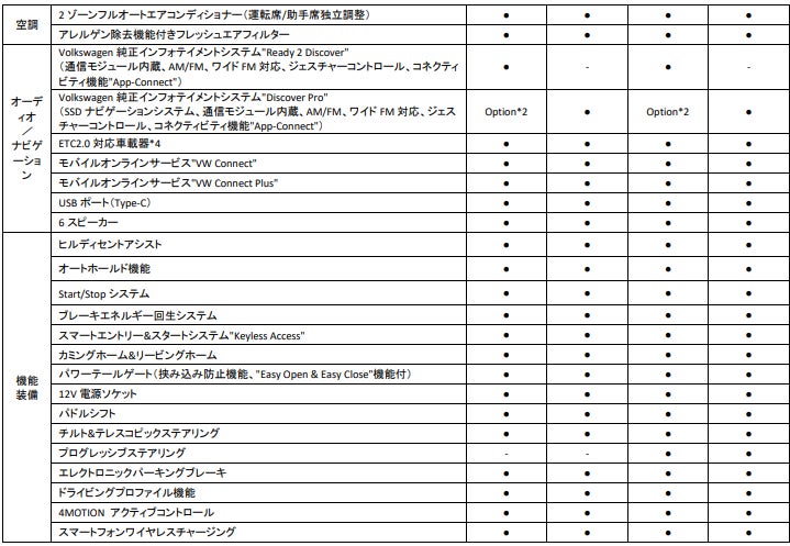 *5:*1はTSI Style、TDI 4MOTION Styleでは*2と、TDI 4MOTION R-Lineでは*2、*3とセットオプションになります。