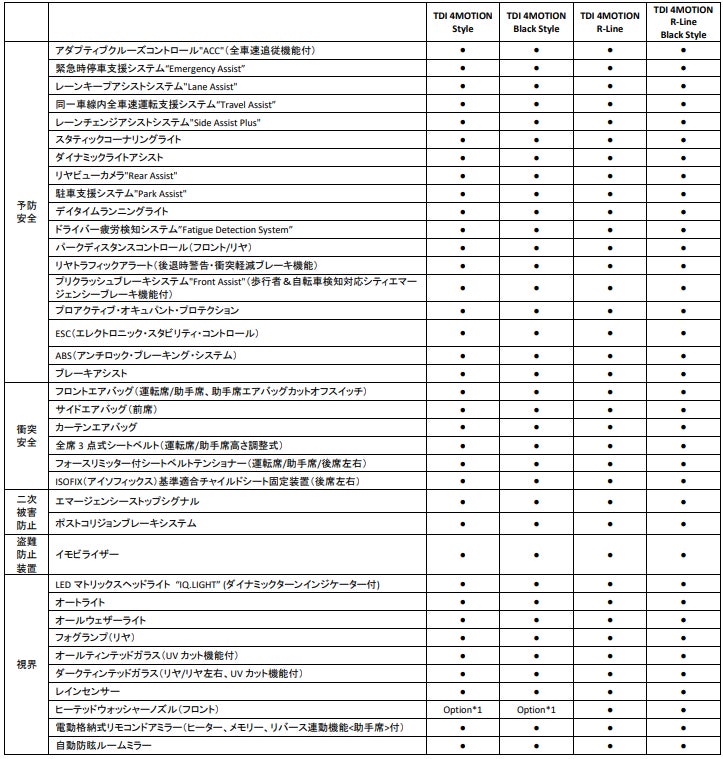 *7:パノラマスライディングルーフはTSI Style、TDI 4MOTION Styleでは*1、*2と、TDI 4MOTION R-Lineでは*1、*2、*3とセットオプションになります。