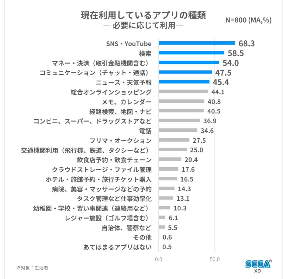 インストールしているアプリのジャンルについて、「必要に応じて利用するアプリ(必要アプリ)」と「個人的な興味や目的で利用するアプリ(個人的アプリ)」それぞれにおいて聞いたところ、「SNS・YouTube」が68.3%とトップ。次いで、「検索(58.5%)」「音楽・動画配信(57.5%)」「マネー・決済(54.0%)」の順。