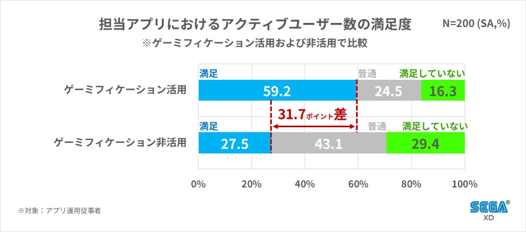 担当しているアプリのアクティブユーザー数の満足度について聞いたところ、担当しているアプリでゲーミフィケーションを活用している人は、59.2%が「満足している(とても満足している、満足している の合計)」と回答。活用していない人に比べ、31.7ポイント高いという結果です。