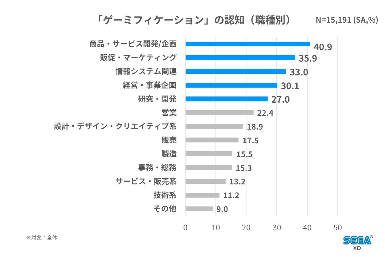 ゲーミフィケーションについて、どの程度知っているかを聞いたところ、16.0%が「知っている(ある程度説明できる、聞いたことがある程度 の合計)」と回答。職種別にみると、「商品・サービス開発/企画」が40.9%と最多。次いで、「販促・マーケティング(35.9%)」、「情報システム関連(33.0%)」、「経営・事業企画(30.1%)」と、企画職従事者は、3人中1人程度がゲーミフィケーションについて知っていることがわかりました。