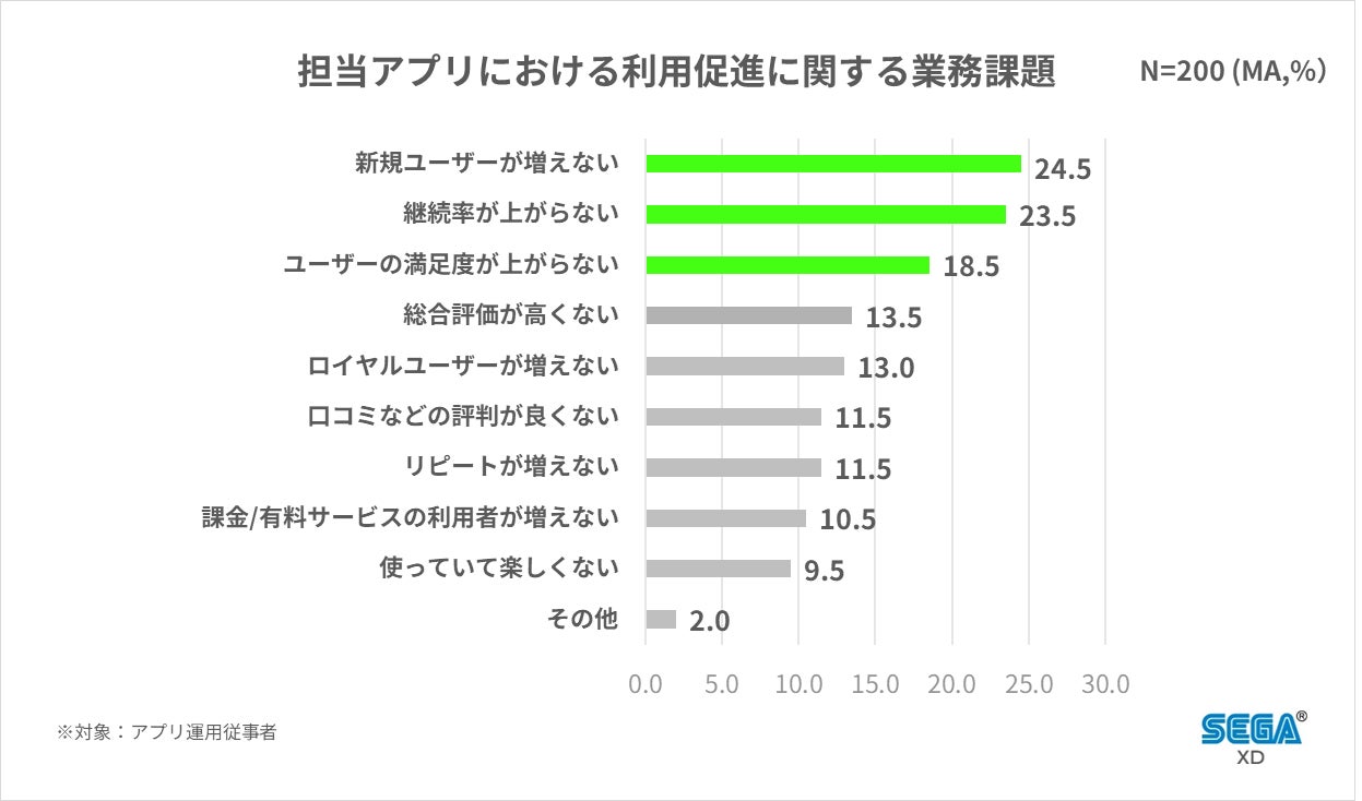 アプリ運用従事者に、担当するアプリの利用促進に関する業務課題について聞いたところ、「新規ユーザーが増えない(24.5%)」、「継続率が上がらない(23.5%)」、「利用者の満足度が上がらない(18.5%)」がトップ3となりました。