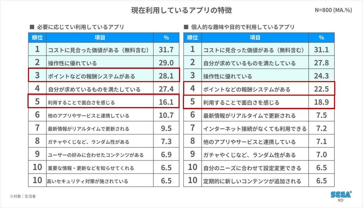 「必要アプリ」と「個人的アプリ」それぞれにおいて、現在利用しているアプリの特徴を聞いたところ、ともに「コストに見合った価値がある」がトップで約3割という結果。また、順位は若干異なるものの、「操作性に優れている」「ポイントなどの報酬システムがある」「自分が求めているものを満たしている」「利用することで面白さを感じる」が上位にランクインし、同様の特徴が並びました。ゲーミフィケーションの特徴でもある“ポイント”や“面白さ”が、ユーザーからも求められていることがわかりました。