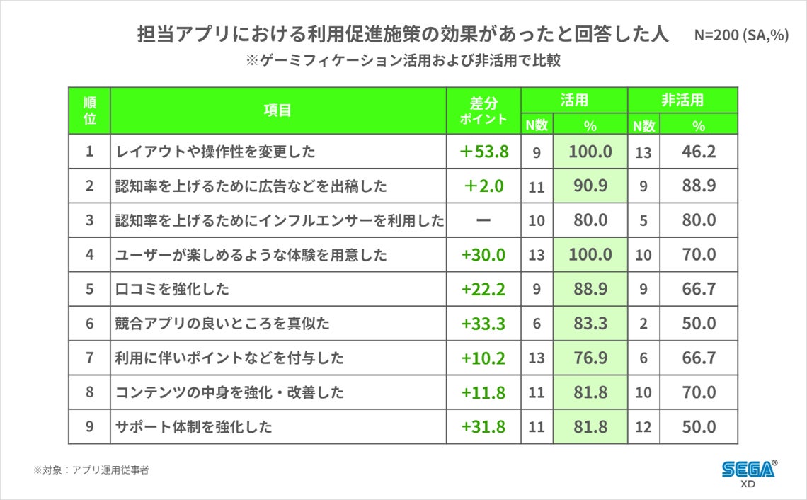 7.ゲーミフィケーションを活用しているアプリ運用従事者は、ゲーミフィケーションを活用していない人に比べて、利用促進施策の効果を実感している人の割合が高いことが判明