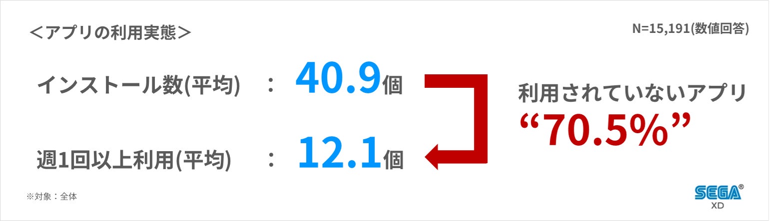 2.アプリのインスール数の平均は40.9個。週1回以上利用しているアプリの平均は12.1個と、約7割が利用されていない「休眠アプリ」という結果