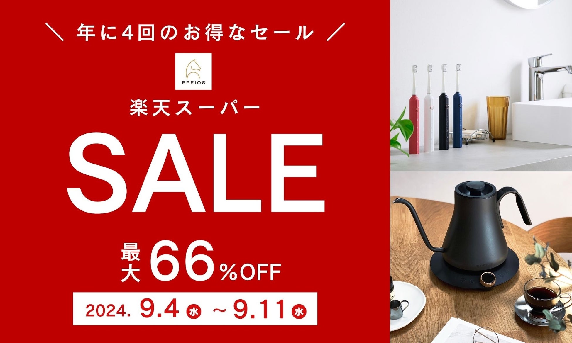 株式会社 EPEIOS JAPAN(所在地:東京都中央区、代表者:駒崎竹彦)は、9月 4日(水)よりスタートする『楽天スーパーセール』でテレビ番組等 多数のメディアで紹介話題の36モデル=過去最大規模のラインナップ数を最大66%OFFでセールに参加します。