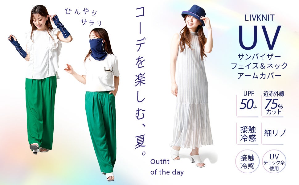紫外線で色が変わる!接触冷感の細リブ生地で汗がベタつかずサラリと快適。UV対策アイテム3種を新発売。
