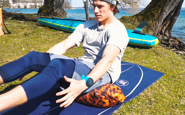 腰に入れて、脚を中に浮かべて上下させれば、腰にやさしい腹筋も可能。