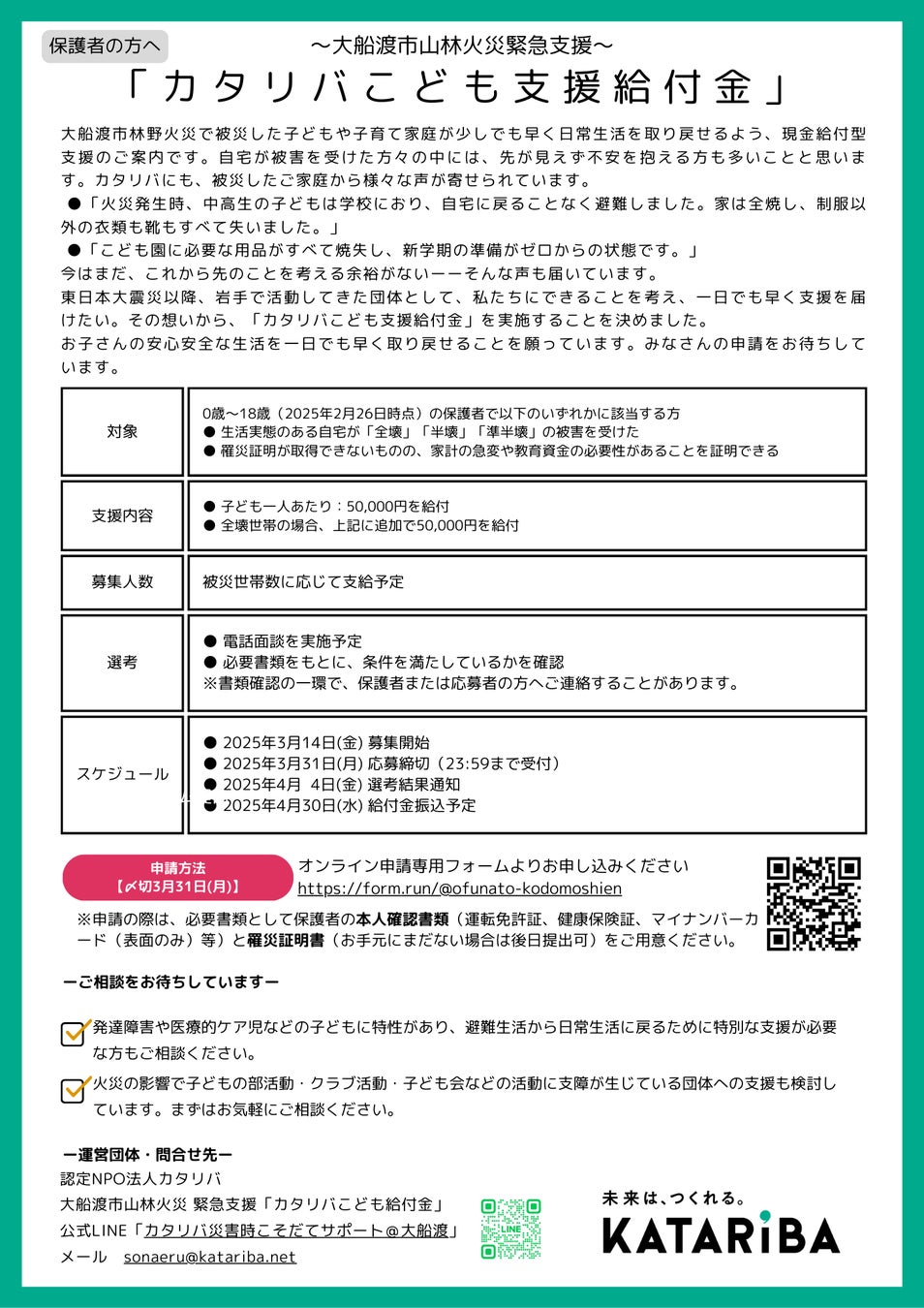 大船渡市山林火災 緊急支援「カタリバこども支援給付金」概要