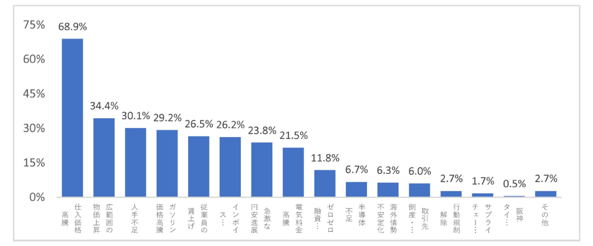 次いで、「広範囲の物価上昇」34.4%、「人手不足」30.1%が上位を占めました。