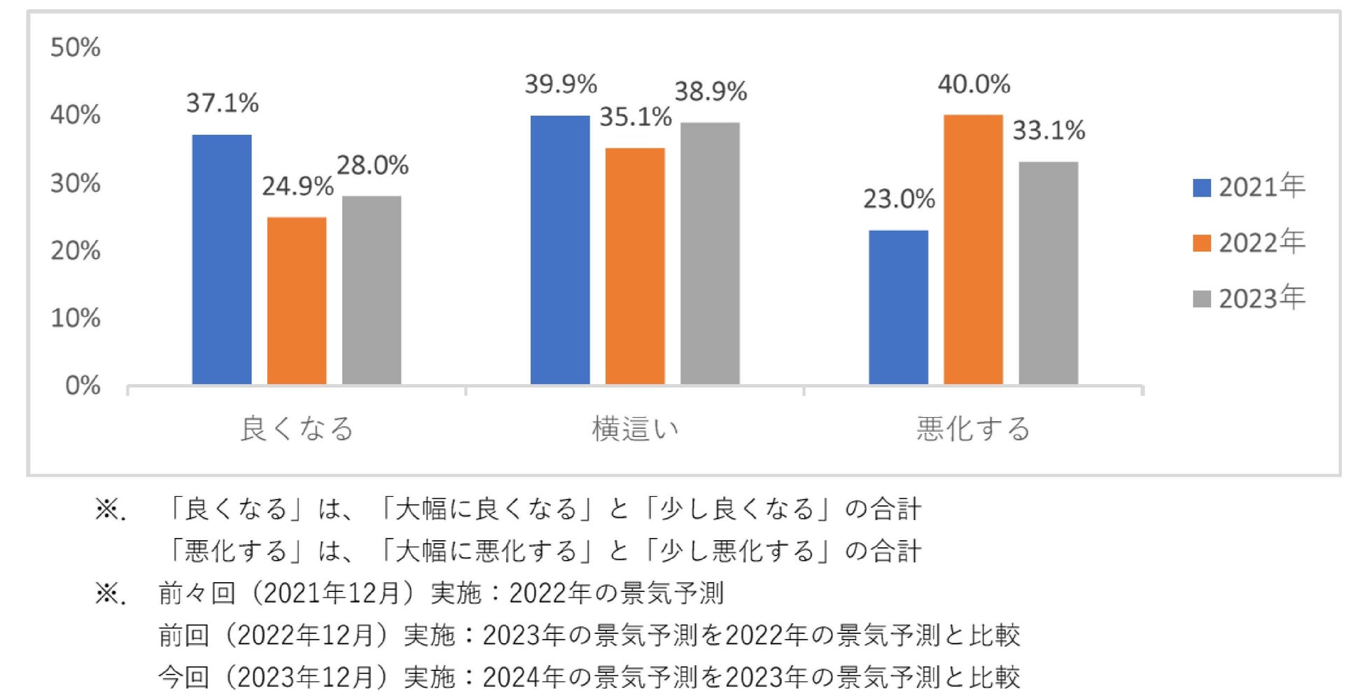 2023年の日本の景気は、「良くなった」17.5%、「横這い」49.0%、「悪化した」33.5%となり、一段と悪化したという回答が目立ちました。2024年は、「良くなる」28.0%、「横這い」38.9%、「悪化する」33.1%となり、厳しいながらも3割近くが良くなると予測しており、二極化が進むことが予想されます。