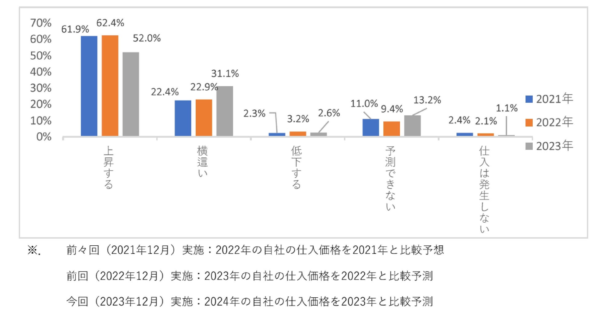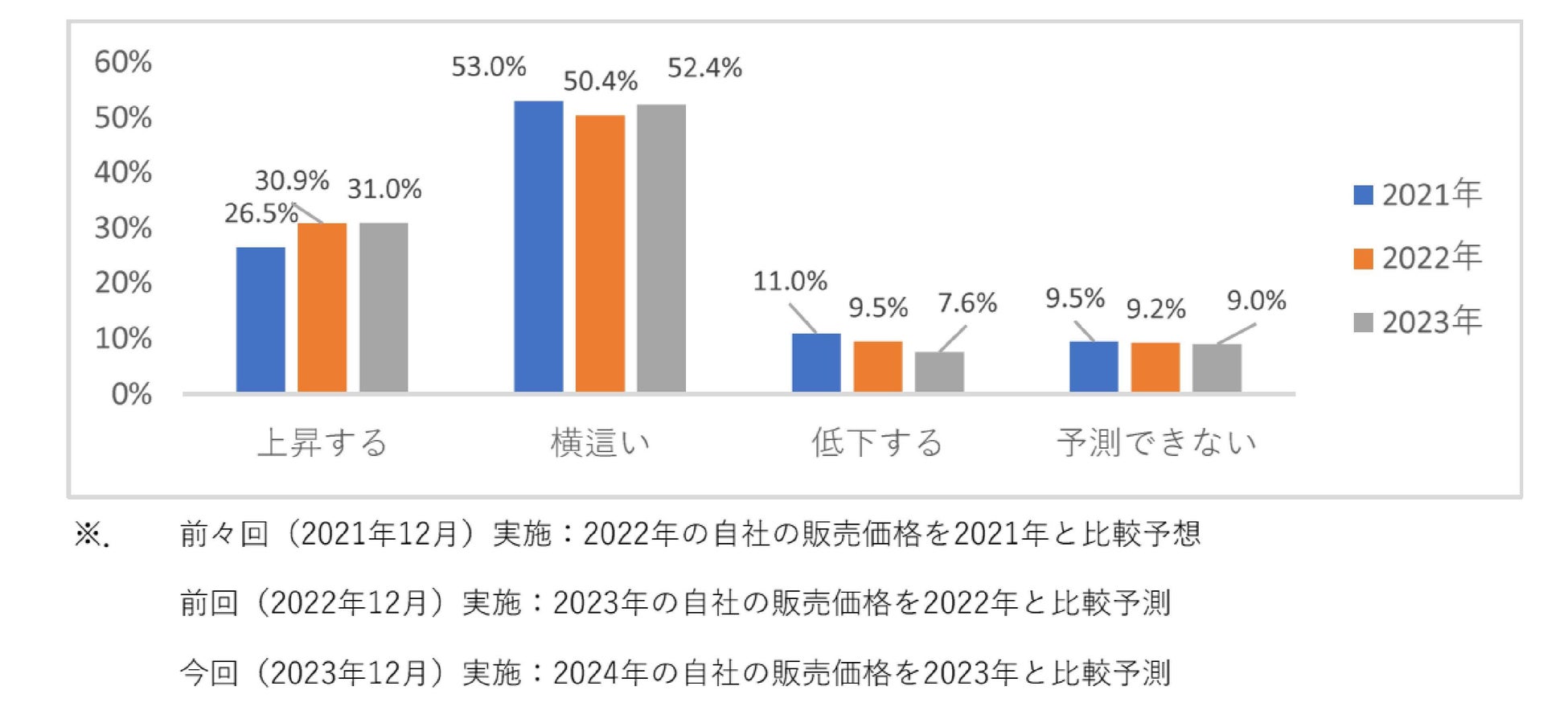 2024年の自社の業績は、販売価格が「上昇する」31.0%に対して仕入価格が「上昇する」52.0%と大きな差があり、一定程度価格転嫁が進んだ2023年からさらに価格転嫁を推し進めることができるかが業績改善のポイントとなりそうです。