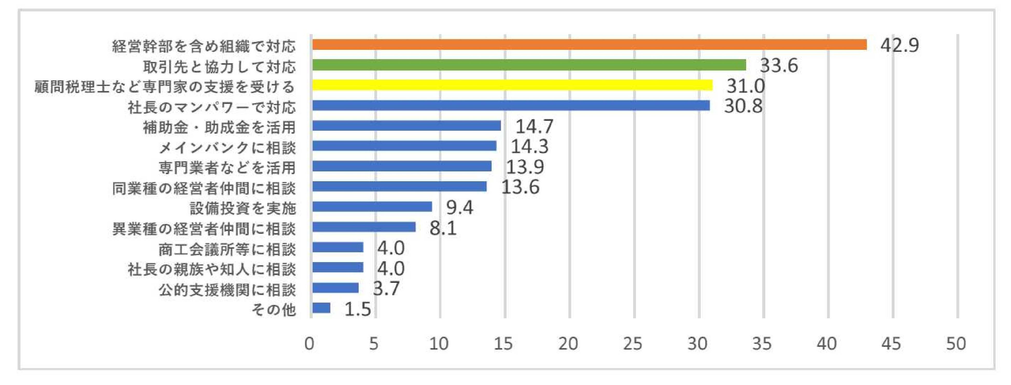 組織力で対応できる人員が多い企業でも苦戦する課題が多く、「メインバンクに相談」14.3%、「専門業者などを活用」13.9%といった対応策を検討する回答もあり、社外の協力者・支援者との関係を活用することが重要な要素となりそうです。