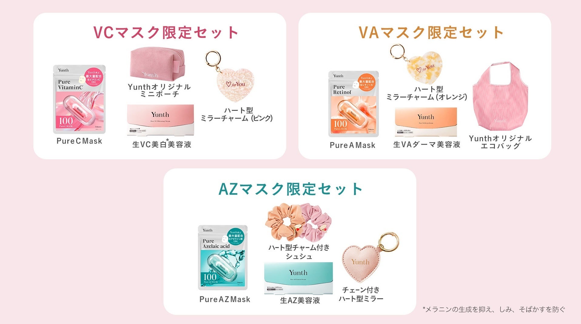 人気の美容液と新発売のシートマスク、そしてYunthオリジナルのノベルティをセットにしたポップアップ特別限定セットを3種販売します。