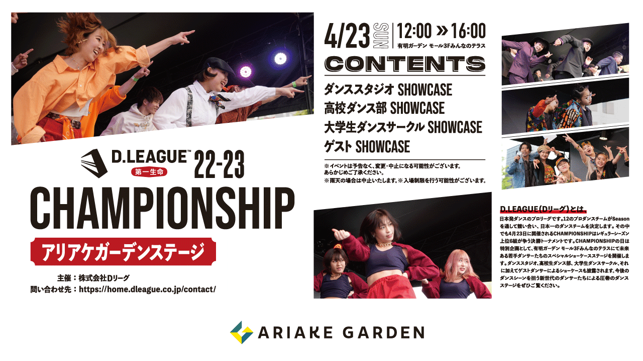 ●イベント概要 イベント名:D.LEAGUE CHAMPIONSHIP特別企画『アリアケガーデンステージ』 開催日時:2023年4月23日(日)12:00~16:00 場所:有明ガーデン モール3F みんなのテラス 主催:株式会社Dリーグ 協力:住友不動産商業マネジメント株式会社 お問合せ先:https://home.dleague.co.jp/contact/ 入場無料、雨天中止 |