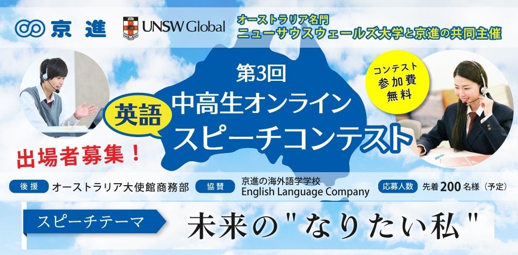京都・滋賀・愛知を中心に全国で学習塾を展開する京進は、「京進×UNSW Global 第3回中高生オンライン英語スピーチコンテスト」を開催いたします。3回目となる今大会は、QS世界大学ランキング(※)2023で45位のオーストラリア名門大学であるニューサウスウェールズ大学(UNSW Global)と京進が共同で主催し、同じくオーストラリアにある、語学学校業界における世界的な賞「ST Star Awards」で南半球最優秀語学学校の殿堂入りをしている、京進の海外語学学校English Language Companyが協賛します。