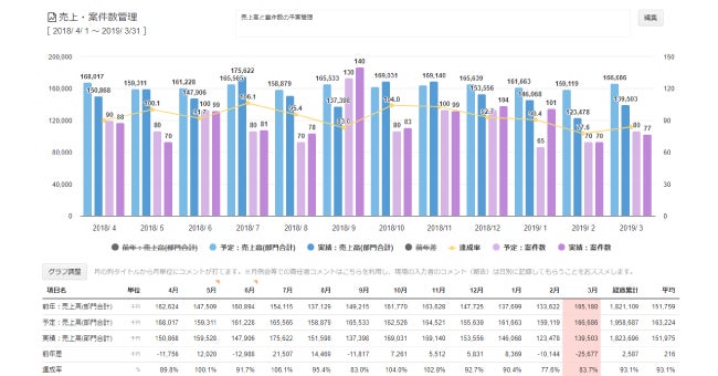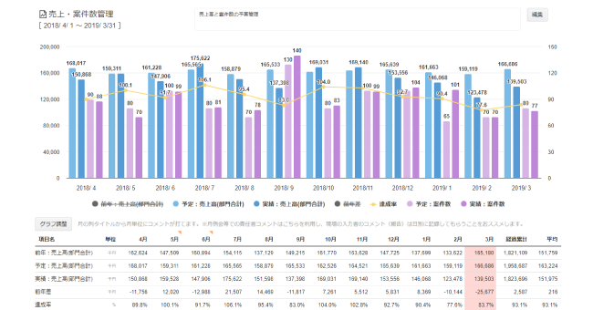 つまり、売上高などKGIの計画達成率を管理しつつ、関連するKPIも一つのレポートで管理できるため、「大局を把握しながら次の一手の具体的なポイント」を判断できます。