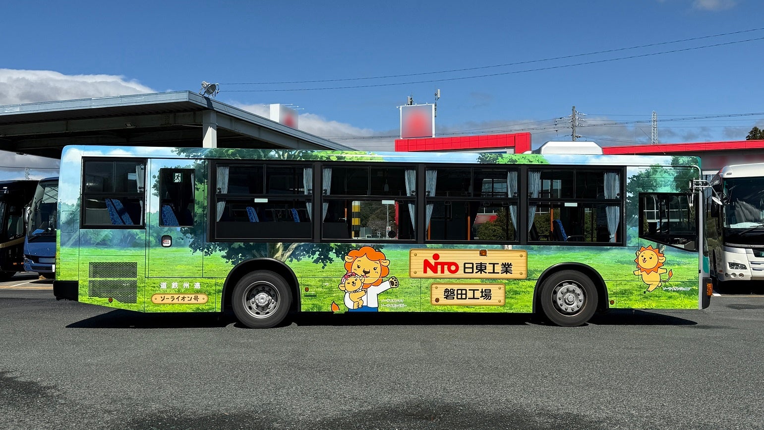 ラッピングバス「ソーライオン号」は、日東工業のイメージキャラクターである「ソーライオンファミリー」が自然の中を楽しく散策するイメージを全面にデザインした車両です。「まもりたい。美しい地球も みんなの暮らしも」というキャッチコピーを掲げ、持続可能な社会を支える日東工業の想いを伝えています。