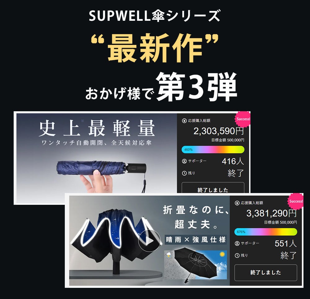 2/7よりマクアケにて予約販売を開始。ぜひ【通知を受け取る】ボタンを押し、いち早くプロジェクト情報をゲットしましょう。www.makuake.com/project/supwell_umbrella/