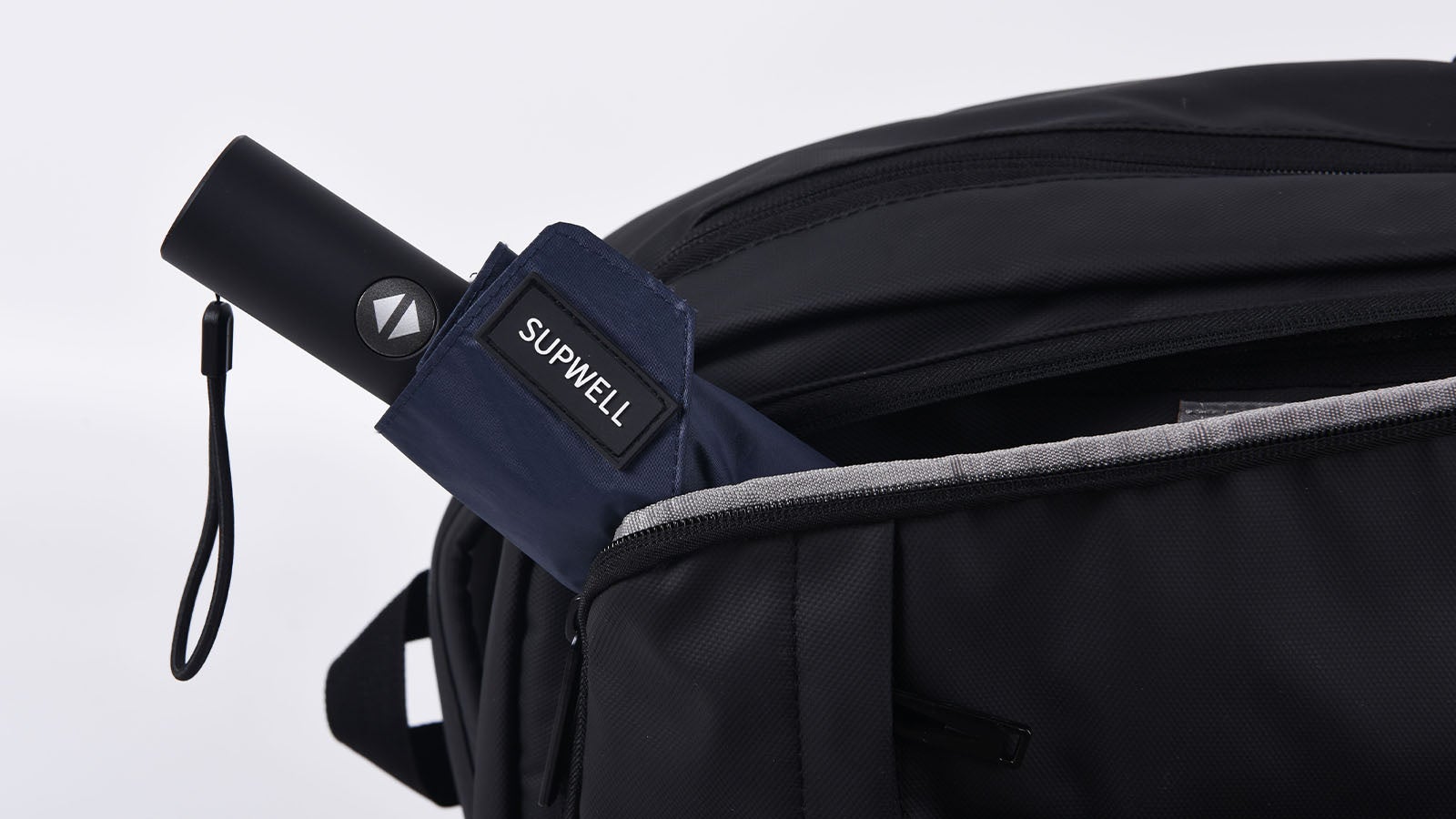 SUPWELLの傘には、通常よりも太い巻き取りベルトを採用しました。これにより、傘布を簡単にしっかり巻き取ることができ、コンパクトにまとめられます。収納袋にもスムーズに入れられるので、煩わしさを感じることなく快適に使えます。