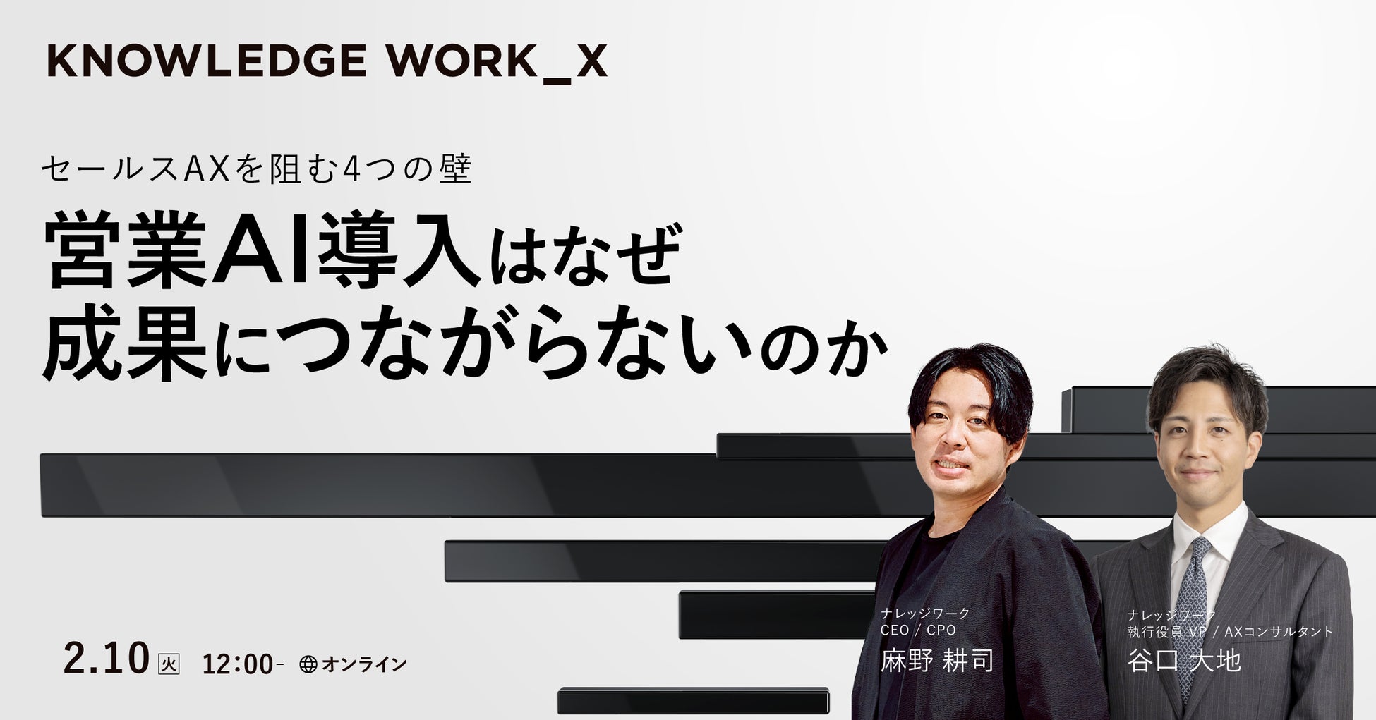 「ナレッジワーク X」の全貌をご紹介するオンラインセミナーを開催いたします。企業が営業部門のAXを進めるうえで直面する課題や、その乗り越え方をご紹介します。営業企画・営業責任者のみなさま、ぜひご参加ください。