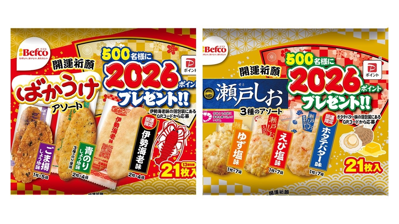 開運祈願シリーズ20周年!“ばかうけ”は伊勢海老味、“瀬戸しお”はホタテバター味を加えた定番2種×限定フレーバーの「2026開運アソート」 11月17日より期間限定発売