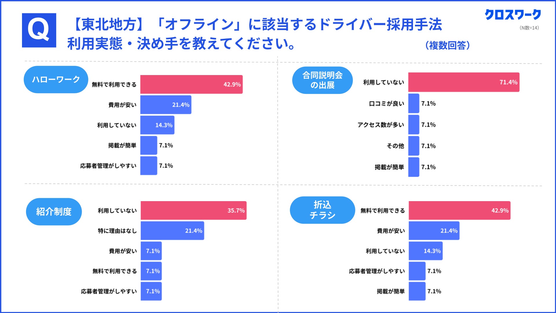 一方、オフライン手法においては、ハローワークと紹介制度を利用している層が多く、選定理由としては「費用の安さ」「口コミがいい」などが挙げられます。ハローワークにおいては、全国平均値では「利用していない」が最多の34.1%であるのに対し、北海道では「利用していない」の回答は挙がらず、東北地方では1割程度にとどまる結果となりました。