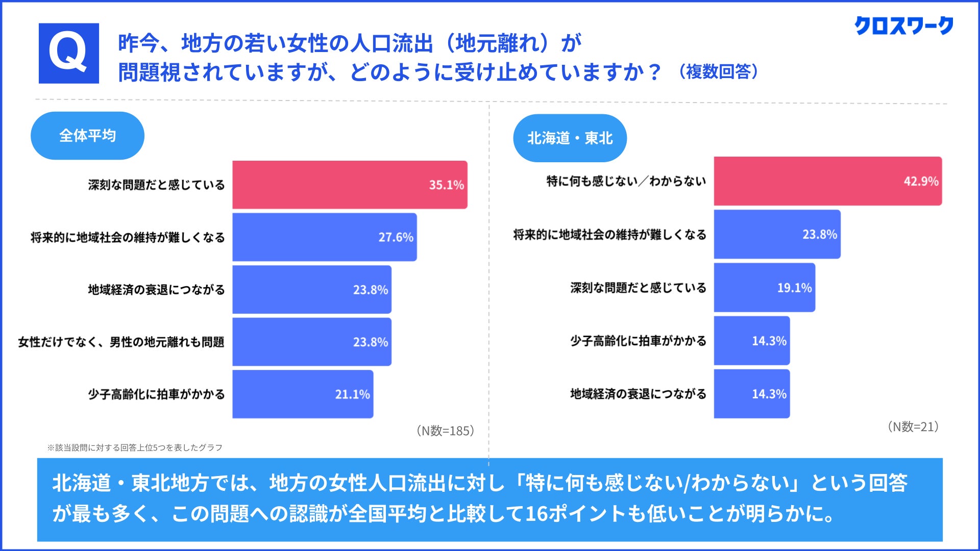 2)北海道・東北、女性人口流出への危機意識が全国平均より約16ポイント低く、「何も感じない」が42.9%