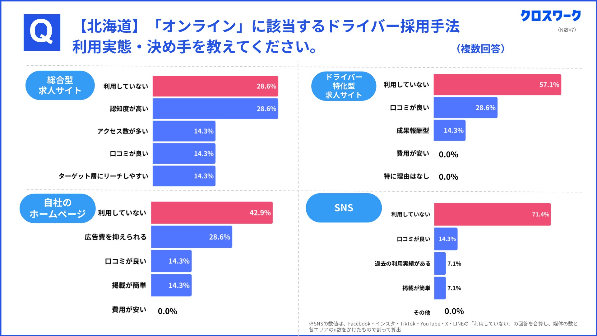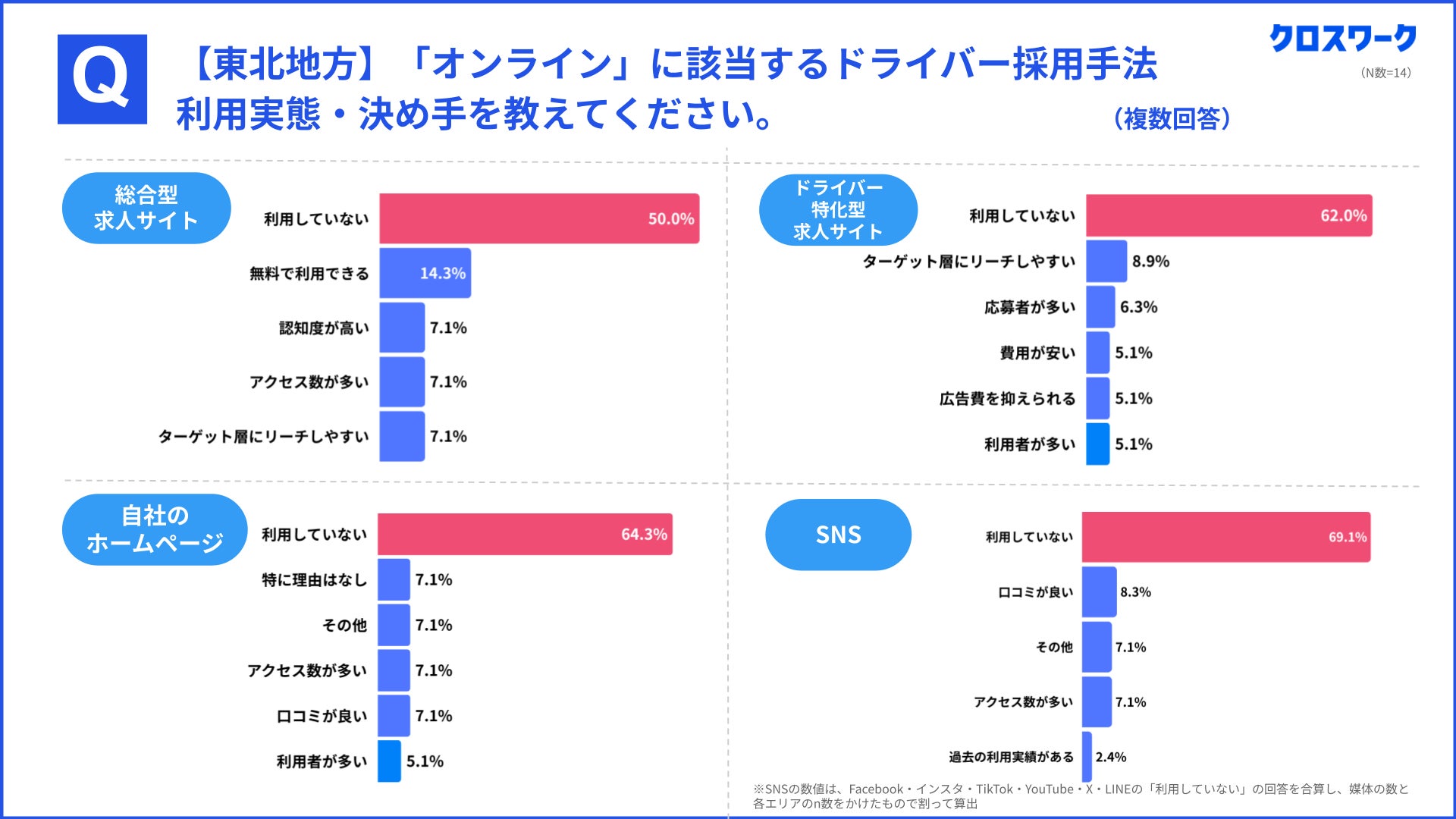 北海道・東北地方の物流事業者にドライバーの採用手法について尋ねたところ、オンラインに該当する総合型求人サイト、ドライバー特化型の求人サイト、自社ホームページ、SNSいずれの媒体も「利用していない」の回答が最も多い結果となりました。