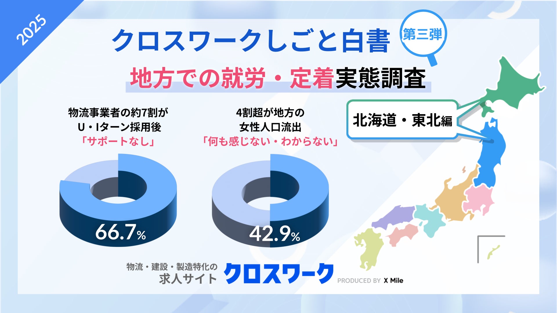 ノンデスク事業者向けの人材採用システム『クロスワーク』を提供するX Mile株式会社(読み:クロスマイル、本社:東京都新宿区、代表取締役:野呂 寛之、以下『当社』)は、物流業界の働き方に関する実態調査「クロスワークしごと白書2025」の第三弾として、『地方での就労・定着』に関する独自調査をこの度、発表しました。本調査の中から、北海道・東北地方実態に着目したところ、地域特有の地元から離れて働く人材や未経験者向けの支援が未整備である現状、女性の地元離れへの課題意識の低さなどが浮き彫りになりました。
