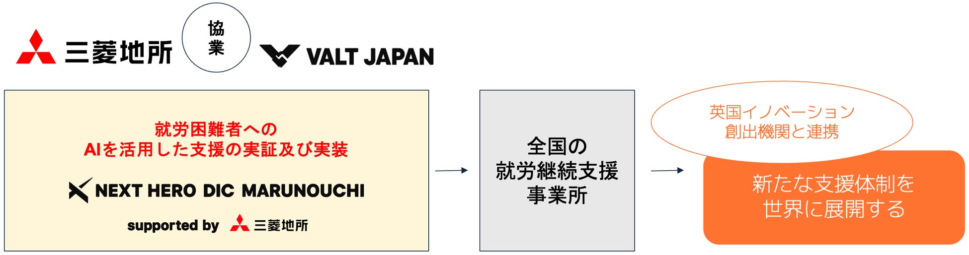 就労困難者に特化したDXプラットフォーム「NEXT HERO」を展開するVALT JAPAN(ヴァルト・ジャパン)は、三菱地所と協業し、AIを活用したビジネス×福祉支援モデルのプロトタイプ開発およびトレーニングの実証・実装に取り組みます。DICを起点に全国の事業所への導入を進め、将来的には世界展開も視野に入れています。
