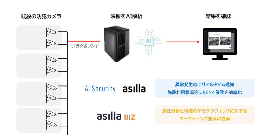 既設の防犯カメラをリアルタイムでAI解析し、特定行動の検出及び各種データの収集することで、清掃業務効率化、マーケティング施策立案、警備体制最適化をデータドリブンで推進します。