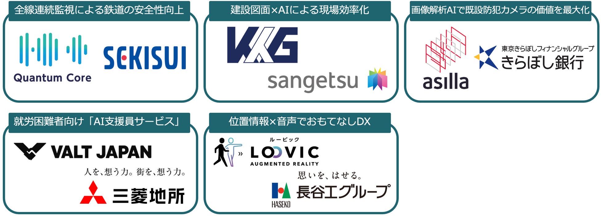 今年度は60以上の御応募の中から、審査とマッチングを経て下記の5件のスタートアップと事業会社の共同プロジェクトを第一弾として選定しました。