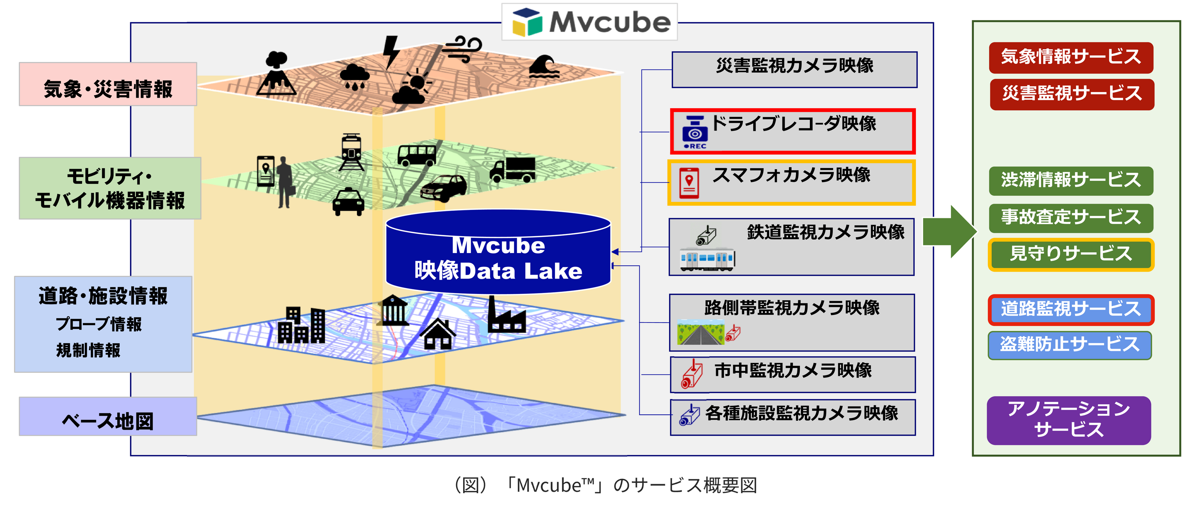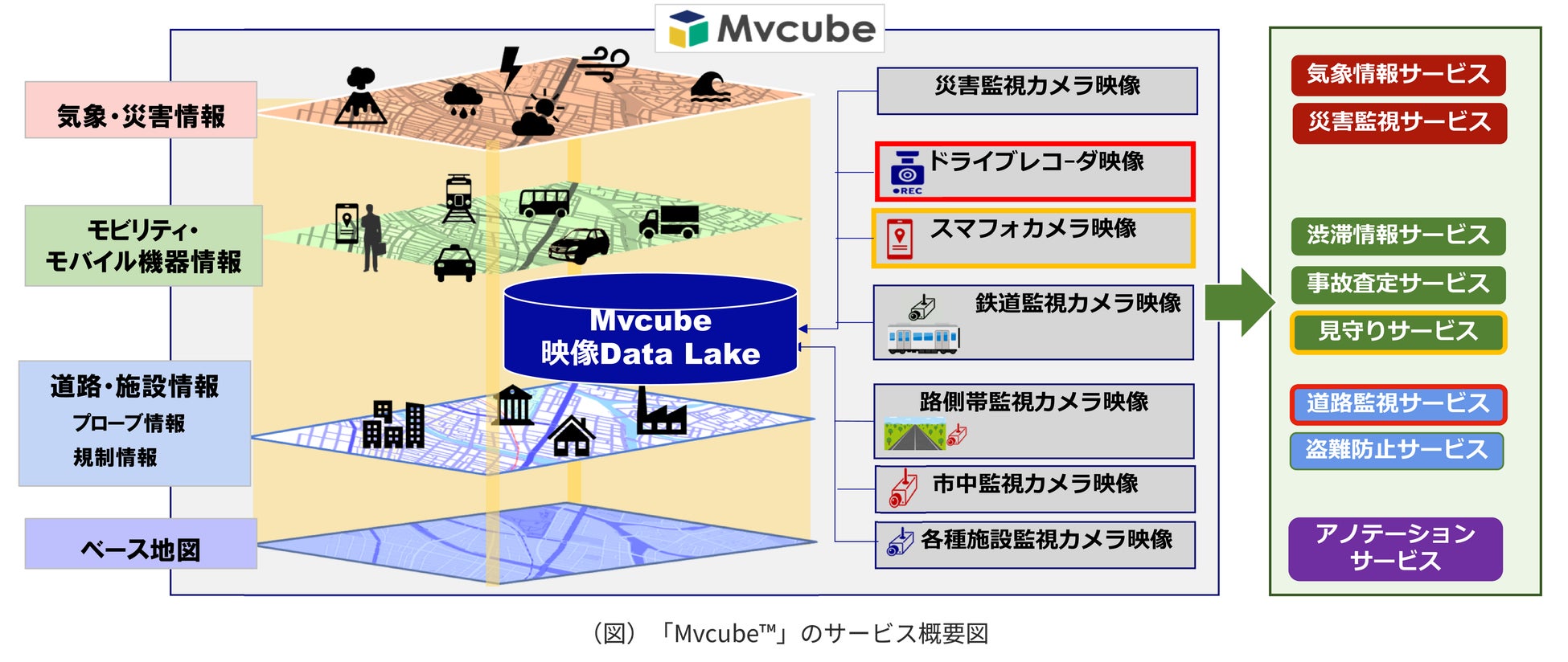 「Mvcube™」は多角的な視点で映像データを収集、配信するサービスです。モビリティや各種監視映像データについて、シーン、位置及び時間に着目し、要求に応じて最適な映像データを提供します。