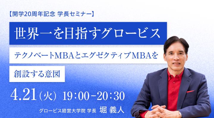 また、記念セミナーの一環として、2026年4月21日(火)にグロービス経営大学院 学長の堀義人によるセミナー「世界一を目指すグロービス〜テクノベートMBAとエグゼクティブMBAを創設する意図」を開催します。本セミナーでは、堀自身がMBAを通してキャリアをどのように切り拓き、どのように社会に還元しているのか、具体的なエピソードを交えお伝えします。セミナー後半では参加者からの質問にもリアルタイムで回答し、MBAで何が得られるのか、テクノロジーが社会を大きく変える時代に求められるリーダー像や能力開発について考える機会を提供します。