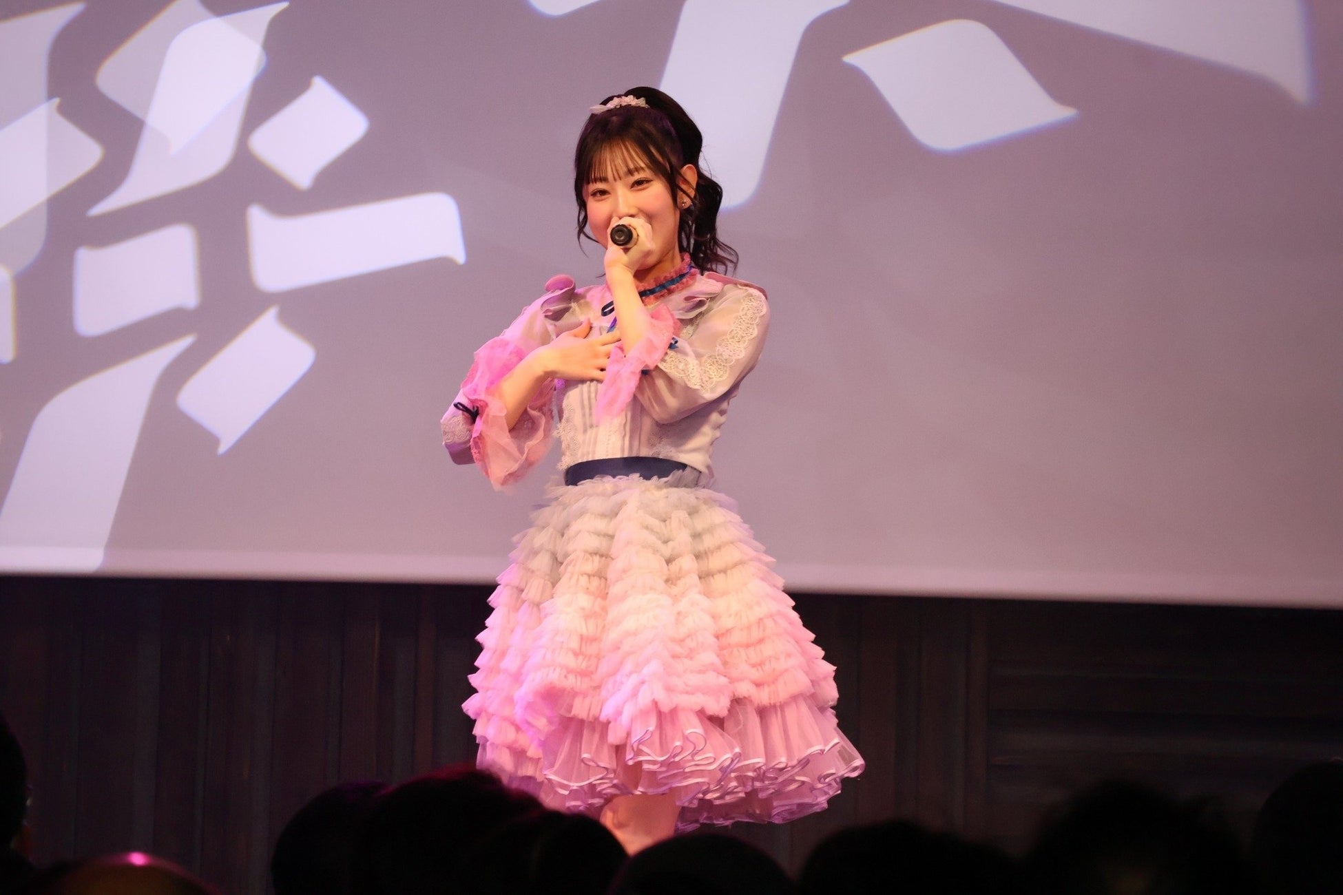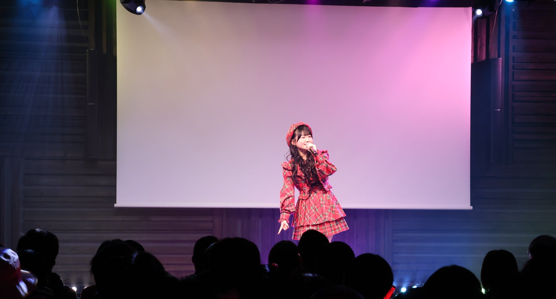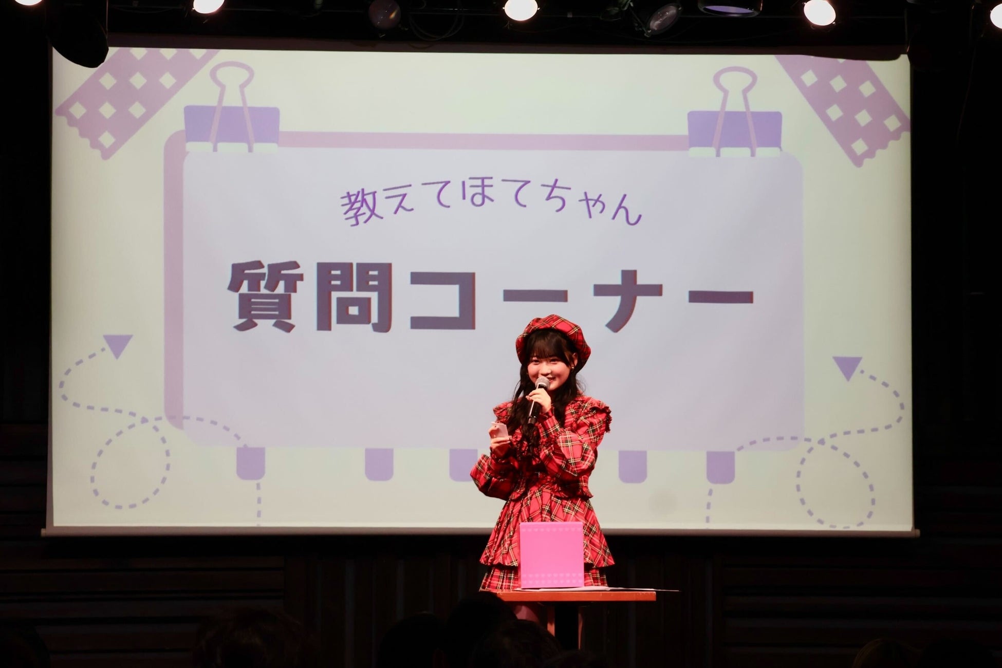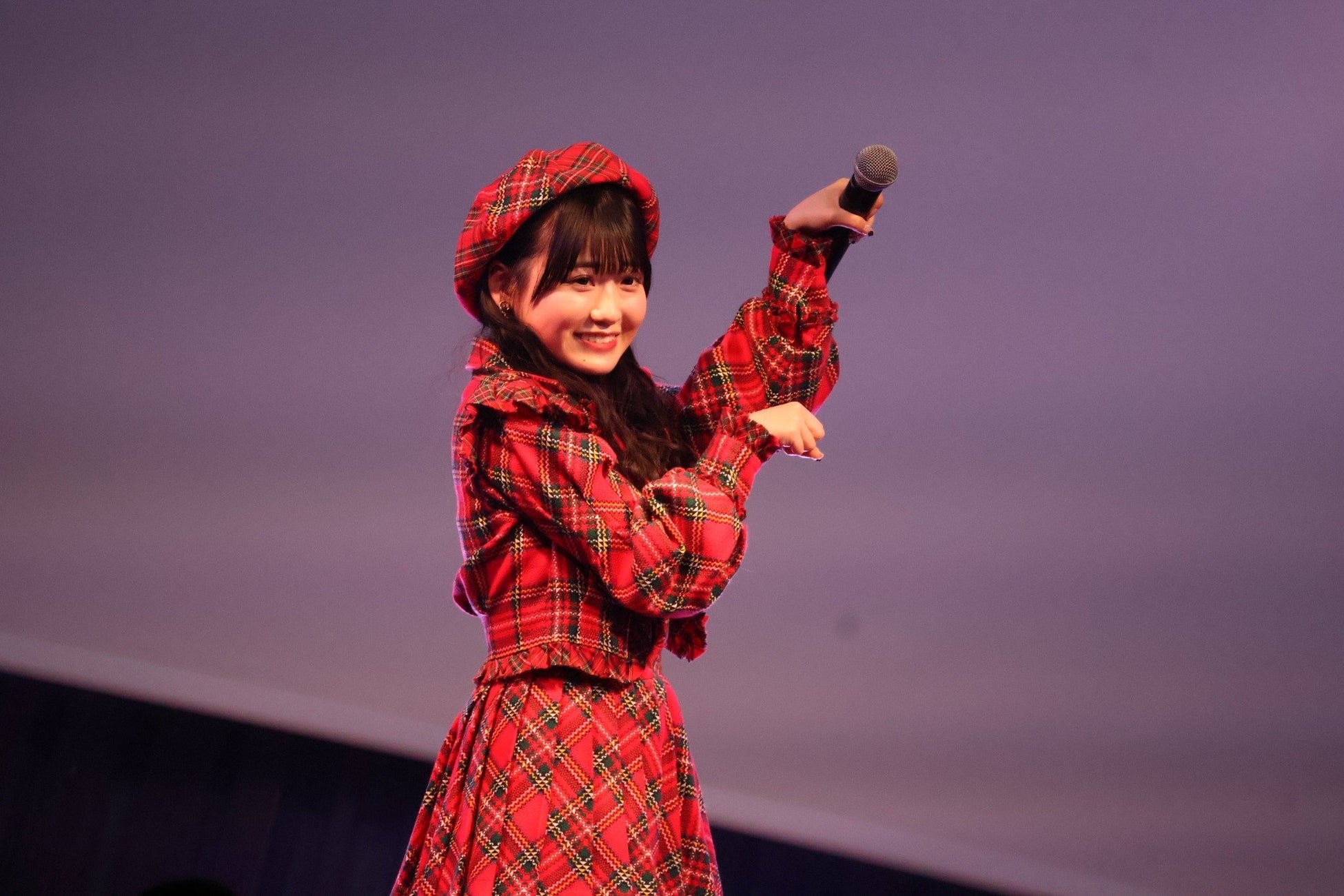 布袋百椛さん初のファンクラブイベント『~好きになってくれてありがろん♪~』が開催され、多くのファンが来場しました。赤いチェックのワンピースをまとった布袋さんが、マイクを片手に鮮やかな歌声を響かせながらステージに登場。その表情には少し緊張した様子が見え隠れしていました。曲が終わると「17期生のライブで披露した思い出の曲なんです」とその理由を明かしました。続けて、新年の挨拶し、イベントがスタートしました。