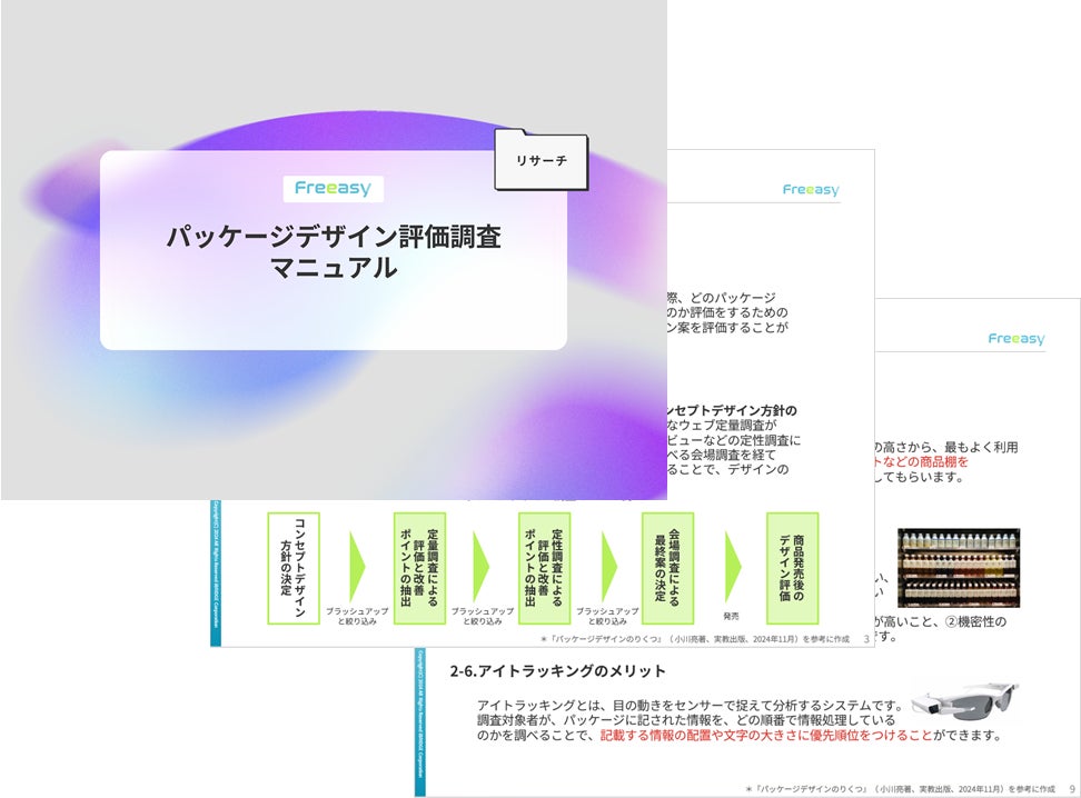全国1,300万人の調査モニターへ、500円からネットリサーチが実施できる、セルフ型アンケートツール“Freeasy(フリージー)”を展開するアイブリッジ株式会社(本社:大阪市福島区、代表取締役社長:荒川和也)は、リサーチやマーケティングに役立つ資料『パッケージデザイン評価調査マニュアル』を無料公開いたしました。
