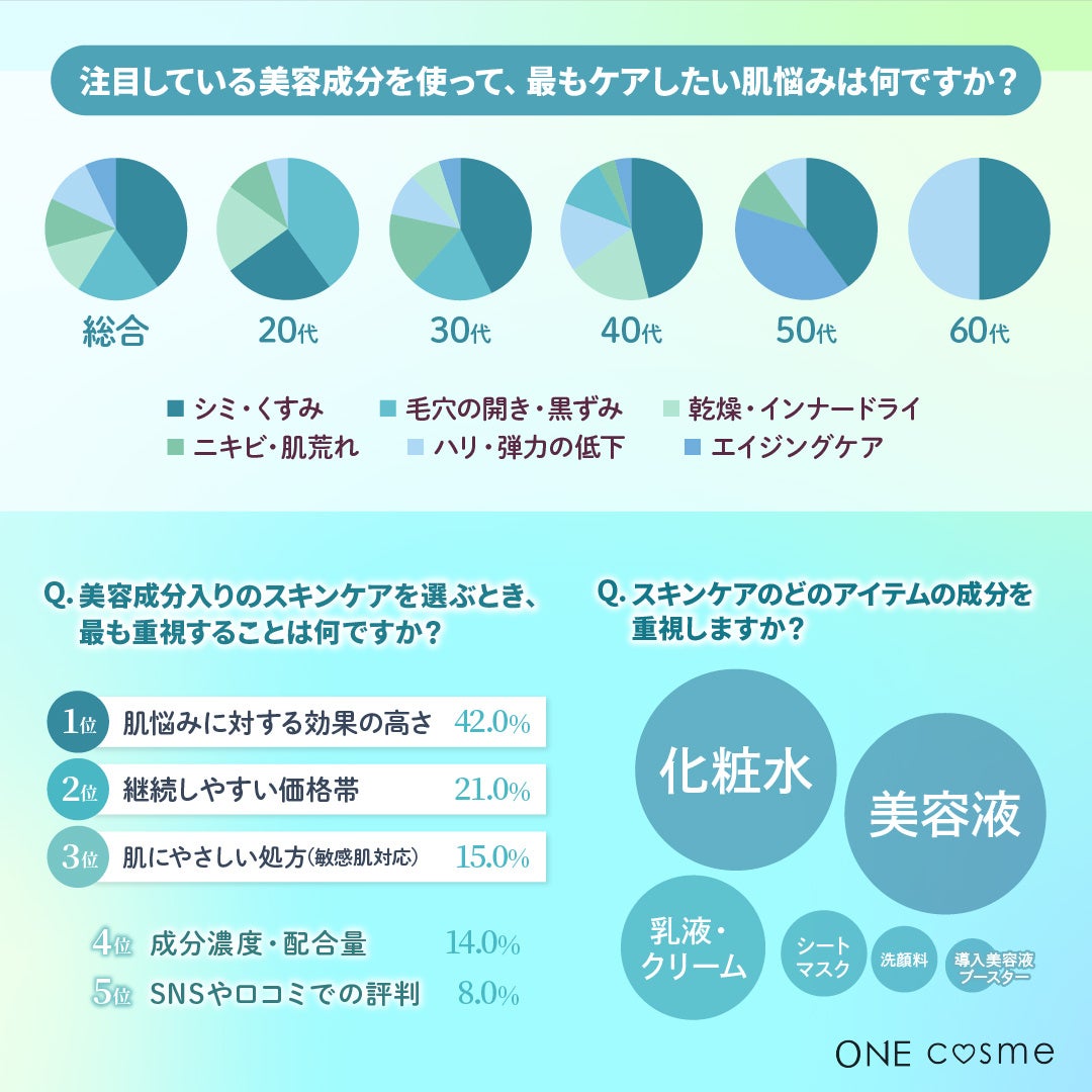 美容成分入りのスキンケアを選ぶ際、最も重視するのは「肌悩みへの効果の高さ」でした。年齢別に人気の美容成分など美容意識の高いユーザー100名の実態を大調査!