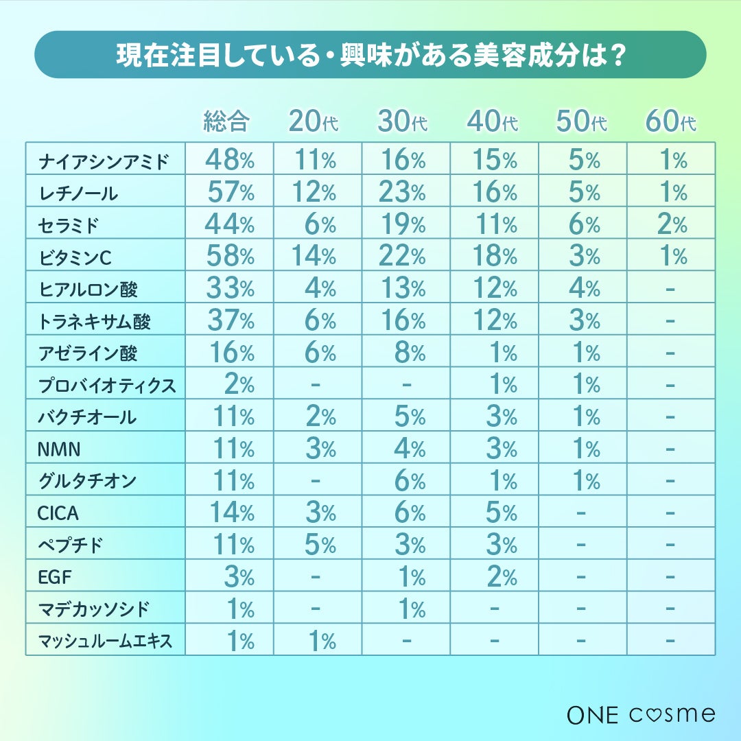 ビタミンCやレチノール、ナイアシンアミドなど、すでに多くの人に支持されている定番成分に加え、NMNやPDRNといった新しい美容成分にも関心が高まっていることがわかりました。