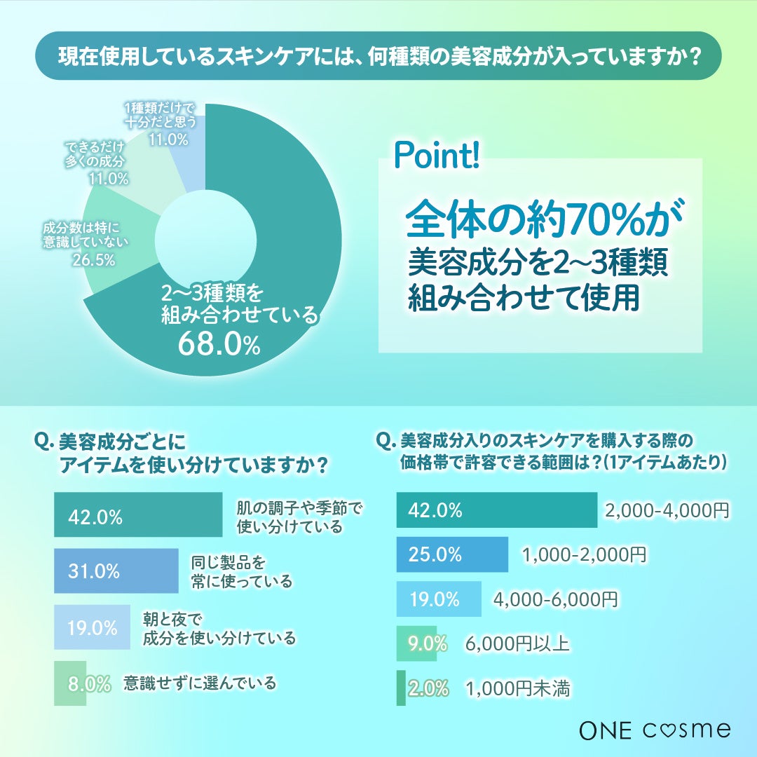【現在使用しているスキンケアには、何種類くらいの美容成分が入っていますか?/美容成分ごとにアイテムを使い分けていますか?/美容成分入りのスキンケアを購入する際の価格帯で許容できる範囲は?(1アイテムあたり)】