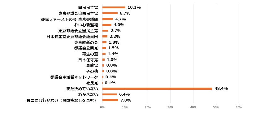 都議選でどの政党・会派の候補者に投票したいか聞くと、国民民主党10.1%、東京都議会自由民主党6.7%、都民ファーストの会東京都議団4.7%、れいわ新選組4.0%、東京都議会立憲民主党2.7%、日本共産党東京都議会議員団2.2%、東京維新の会1.8%、都議会公明党1.5%、再生の道1.4%、日本保守党1.0%、参政党0.8%、都議会生活者ネットワーク0.4%、社民党0.1%、その他0.8%、わからない6.4%、まだ決めていない48.4%、投票には行かない(選挙権なしを含む)7.0%だった。